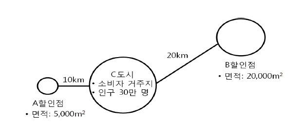 Q.C도시 인근에 A와 B 두 개의 할인점이 있다. 허프(D. L. Huff)의 상권분석모형을 적용할 경우, B할인점의 이용객수는?(단, 거리에 대한 소비자의 거리 마찰계수 값은 2이고, 도시인구의 60%가 할인점을 이용함)